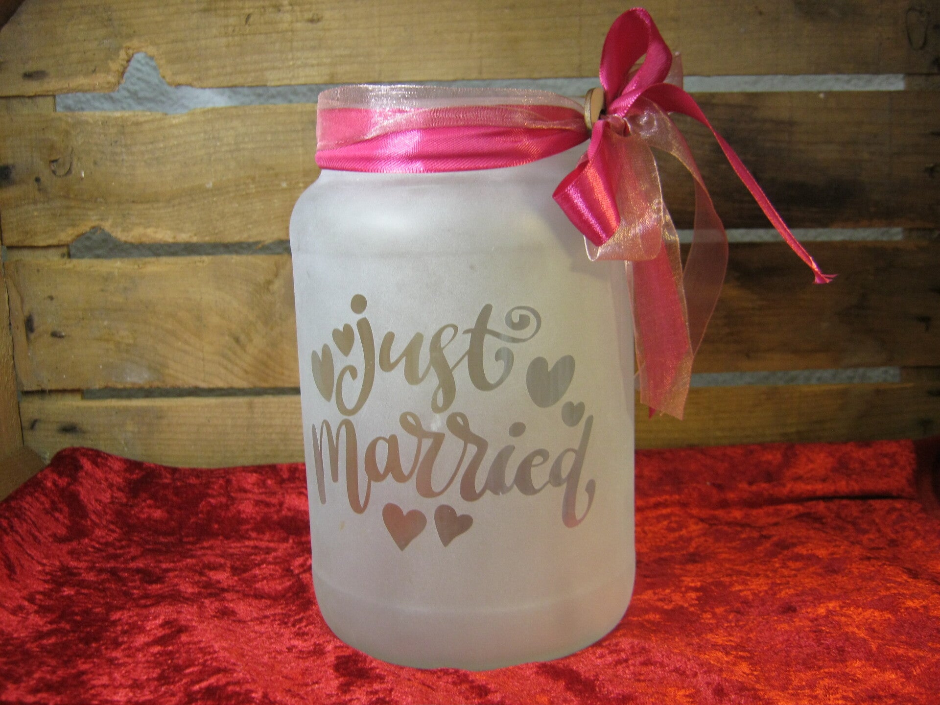 Unsere große Vase eignet sich zum Beispiel sehr gut zur Dekorativen Aufbewahrung Ihres Brautstraußes. Sie ist ein sehr schönes Erinnerungsstück an diesen besonderen Tag. Die Vase ist mit pinken Satin- und altrosa Organza-Band und Holzherz versehen.