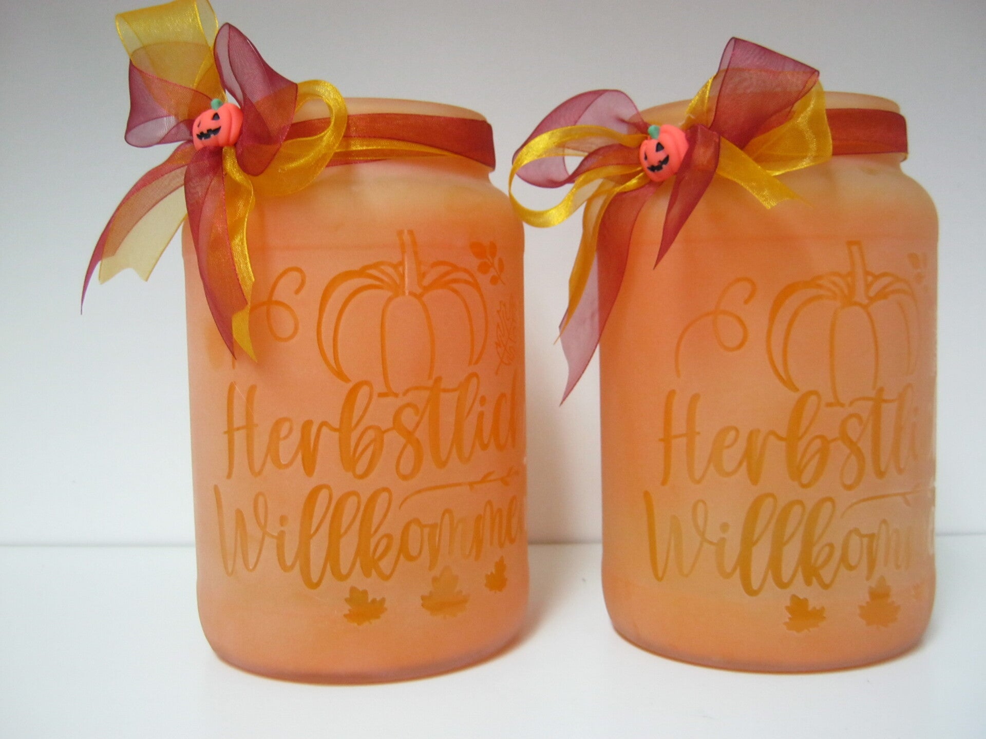 mit Schleifenband und Kürbis verziert